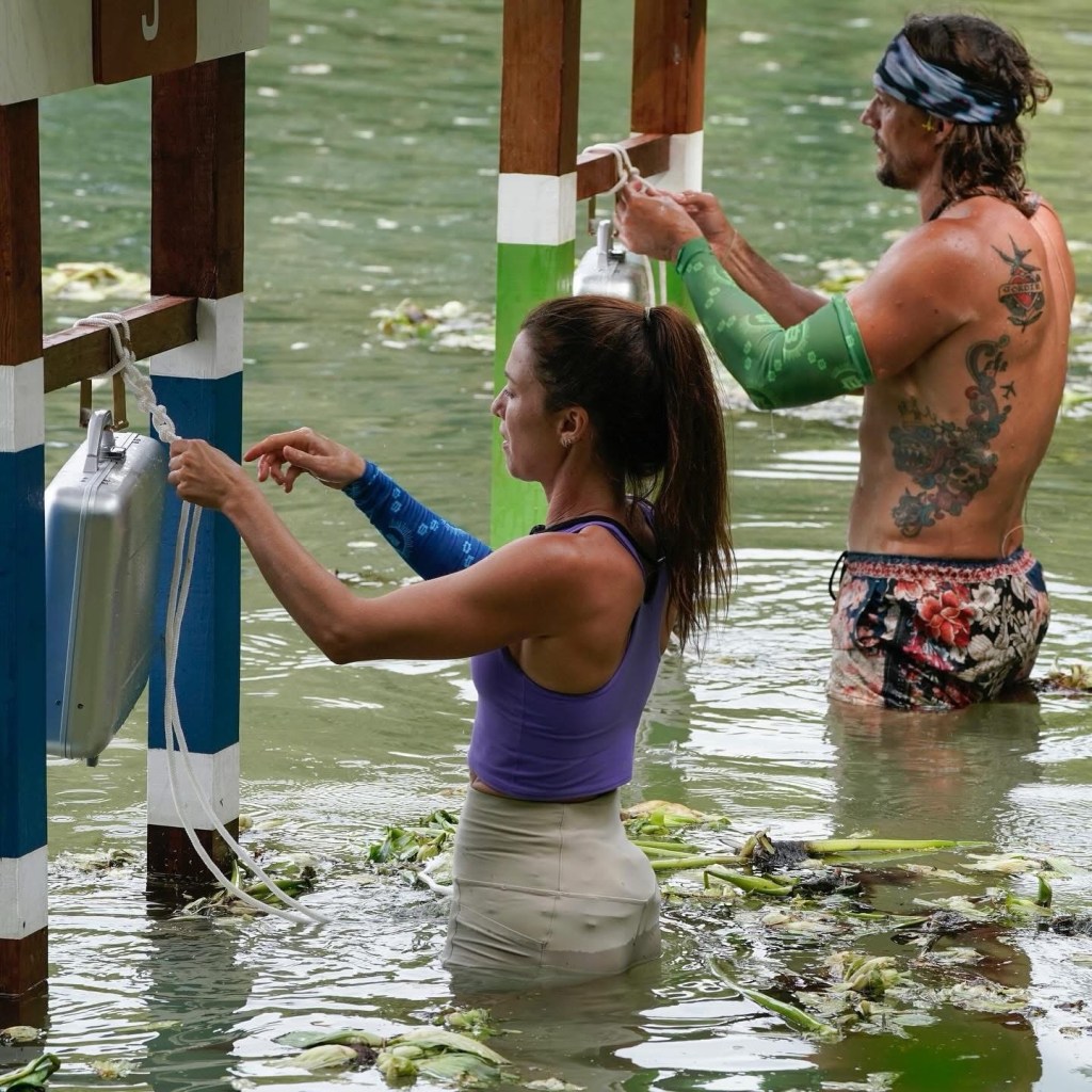 There’s nine briefcases for each team, which have been placed along the shoreline with matching amounts in each case. The team captains will send out one team member at a time to retrieve a case – but only the team captains know the exact case values which are printed inside their ledger. As soon as one team locks in six cases, the game is over.