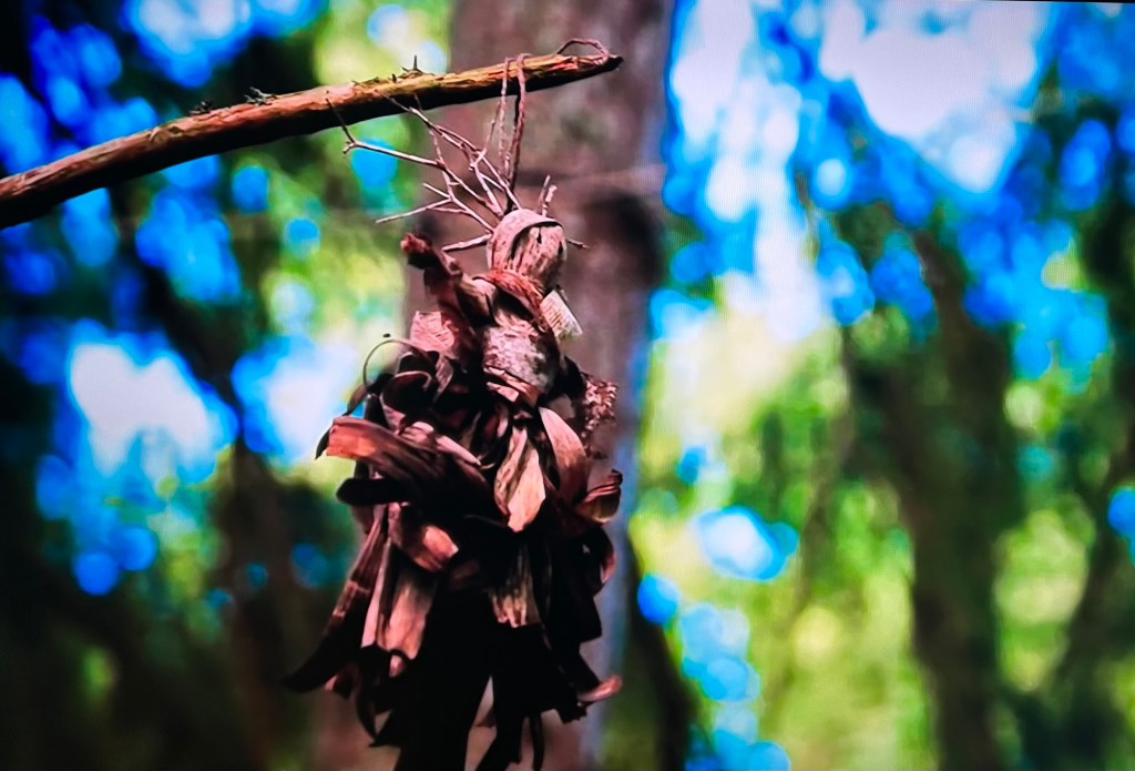 The episode begins with Eric, Ron, Kristen and Caroline still blindfolded and tied to a tree. We don’t get to see who the traitors murder. We just see the traitors standing in front of someone. We see each player up for murder taking off their blindfolds. Next, we see the executioner.