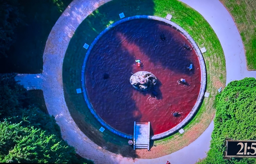 Mission time! It’s the Fountain of the Faithful! They have to search the water of the fountain for coins, which will tell them the location of a statue they have to carry back to complete the fountain. There’s eight statues in all. There’s a shield underneath each statue. If nobody takes a shield, there will be no murder that night. If even one of them takes a shield, it’s murder as usual. They’re playing for $16,000.