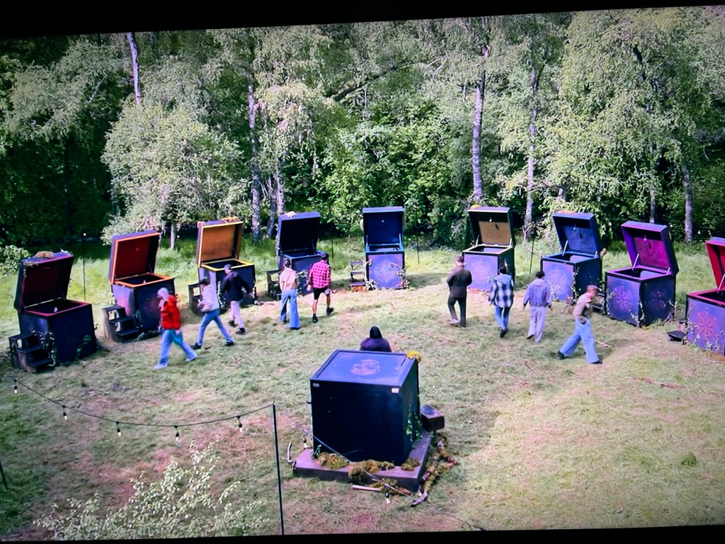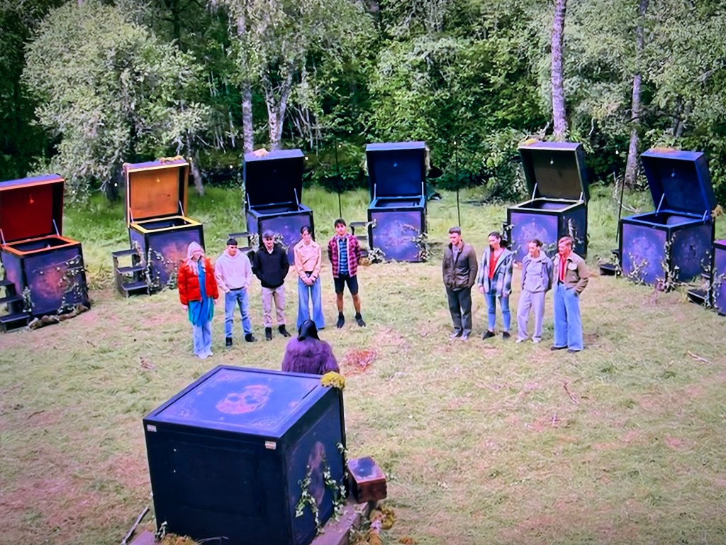 While everyone is inside their boxes, the traitors will secretly come out of their boxes, answer the question, then climb back inside their boxes again. If someone has really good hearing they might be able to hear them. But don’t worry, there’s a drummer going from box to box, making it harder for the faithfuls to hear.
