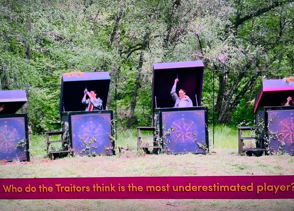 When the traitor’s answer is revealed; a giant traitor, holding the answer card the traitors picked, pops up from the box after Claudia cranks the handle. Exactly like a Jack in the Box would. So, a Traitor in the Box?