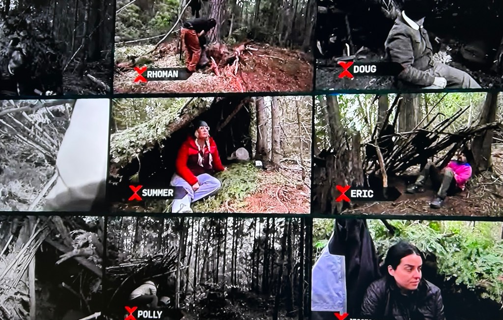 The survivalists are supposed to build their shelters before darkness descends. Some shelters are better than others, of course, and some don’t even have shelters. Everyone soon discovers how cold it can get at night in the wilderness. They really need to get fires going.