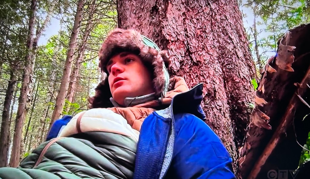 Olsen, a young man has his shelter built, but is bored. Ummm…why don’t you try to start a fire or find food? Soon, a baby bear comes to visit his camp. Who’s bored now? Everyone at HQ watches helplessly in terror, wondering where his parents are? They’re not even in the HQ room where they watch the live feeds. They’re missing all of this. He uses a horn to scare the bear off, which works. Olsen’s parents are horrified when everyone fills them in about what happened. And they missed it!