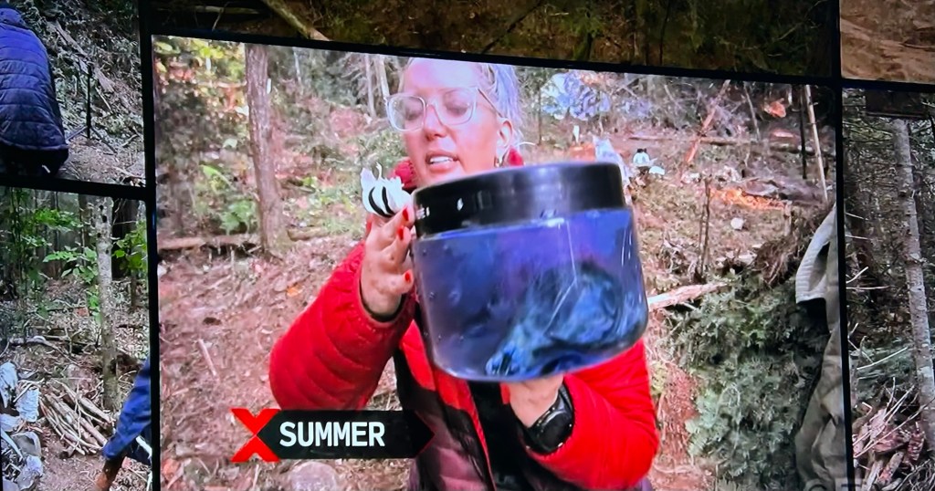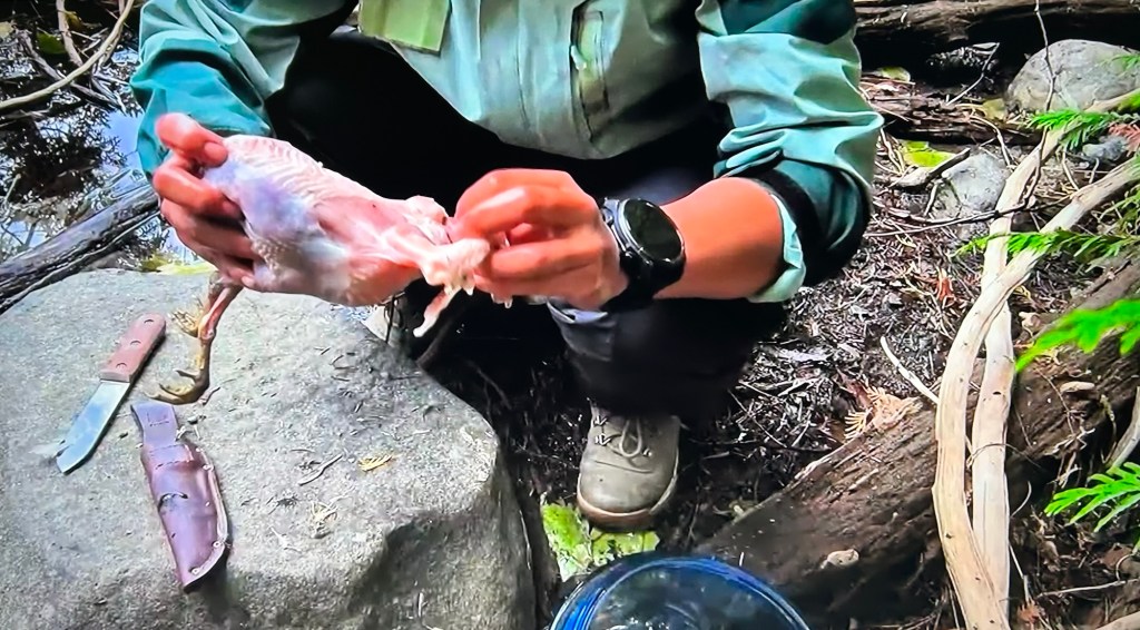 For breakfast, the survivalists have to prepare the grouse to cook, by plucking the feathers off. Summer is scared of birds and doesn’t think she can even touch it.