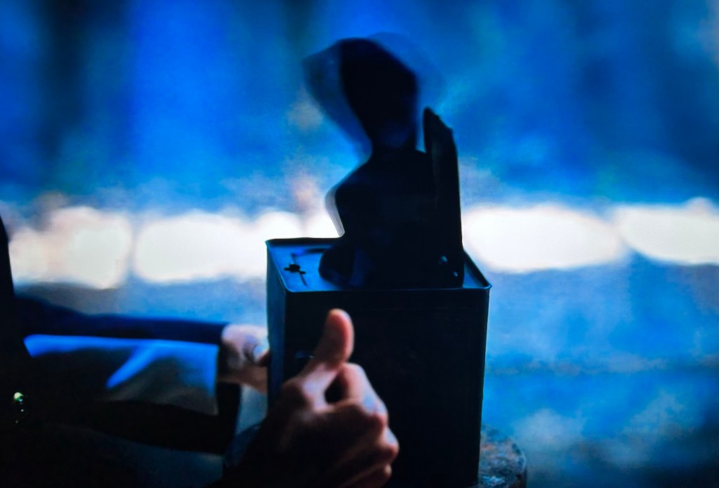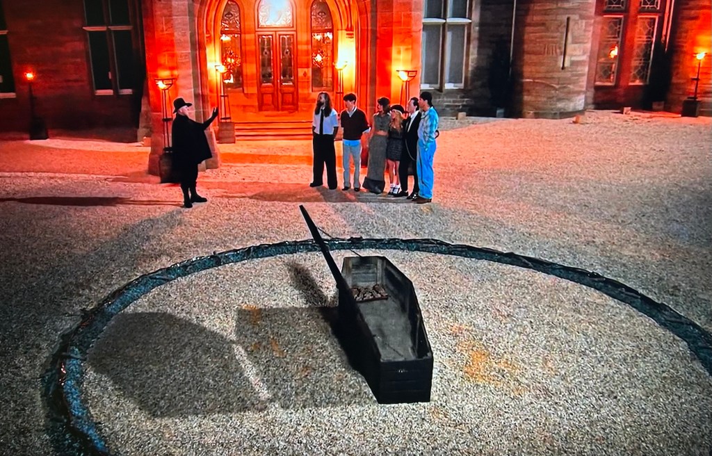Everyone is called outside where there is a coffin waiting for them. Gun power is spread in a circle around the coffin. There’s a soft looking pillow in the coffin.