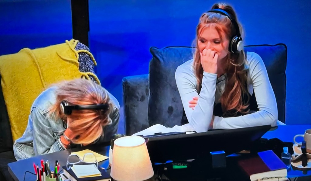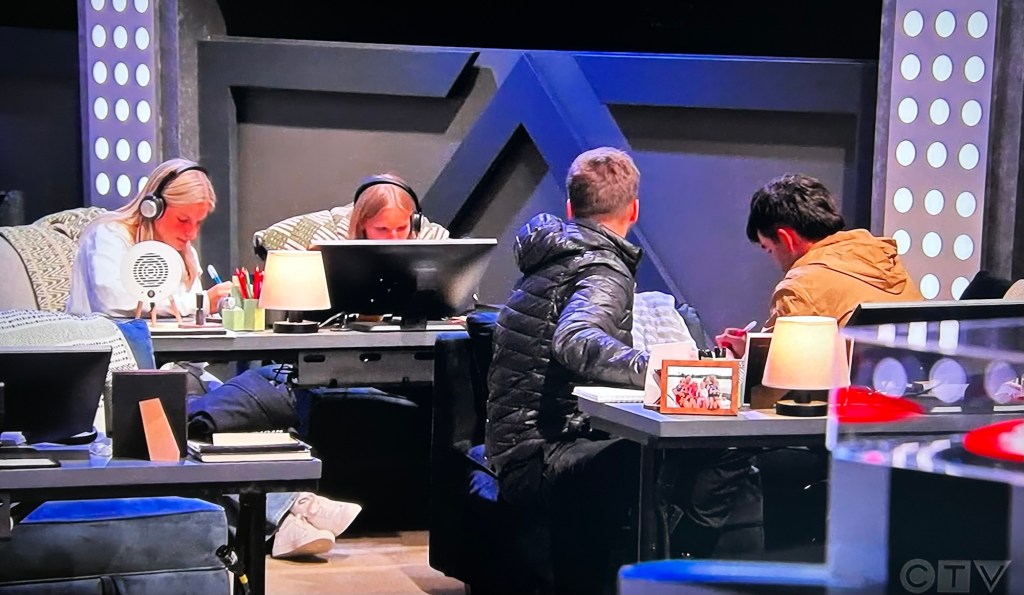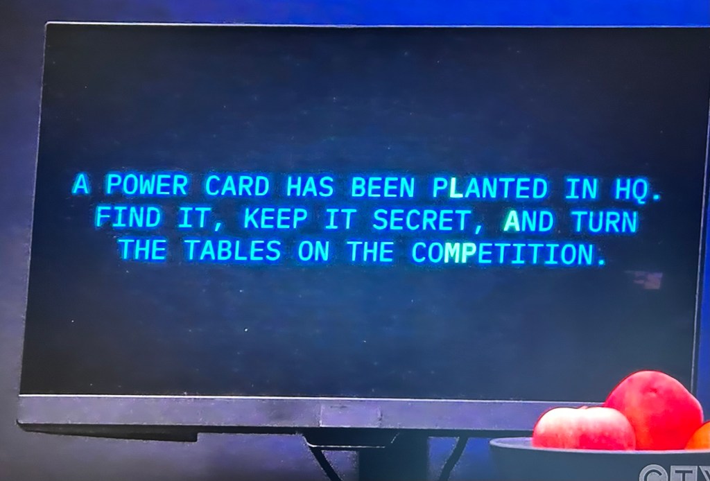 Some of the letters are brighter than the others, spelling out L-A-M-P. Emily finds the black card under the lamp. The only thing is…Skyler is right there and knows about it. As soon as Emily goes to tell Carly about what she found, Skylar tells everybody in HQ that Emily found it. Which is good strategy, IMO.