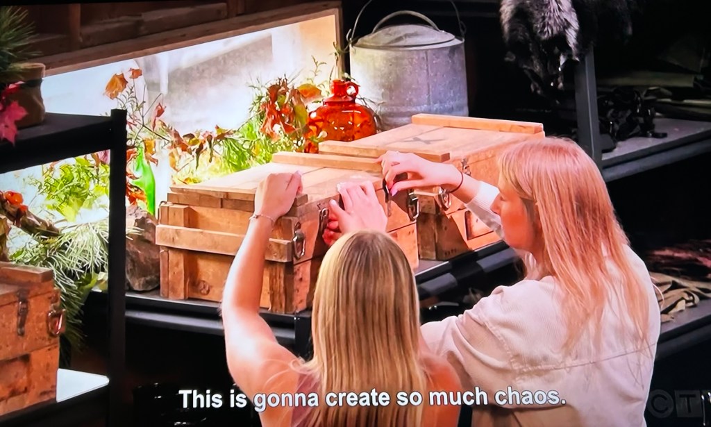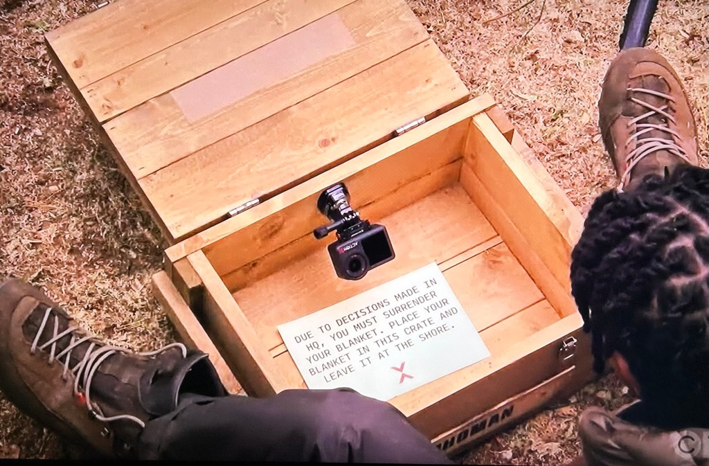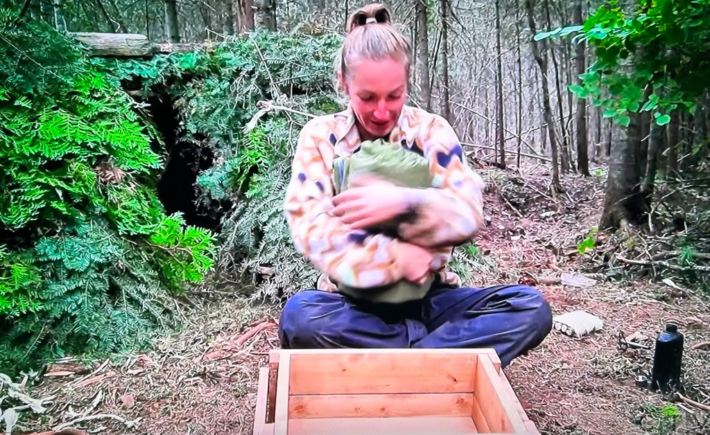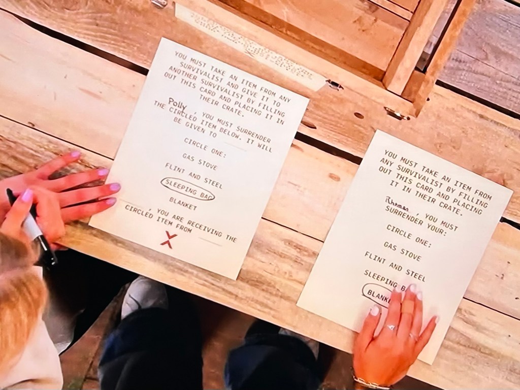 They’re told they can gift any survivalist a sleeping bag, which they give to Katie, of course. But then they’re told to take something out of the game from any survivalist. The girls decide to take Rhoman’s blanket. Then they’re told to take an item from one survivalist and give it to another survivalist. They decide to take a sleeping bag from Polly (excuse me, what?) and give it to Doug (he has a blanket already)!?!?