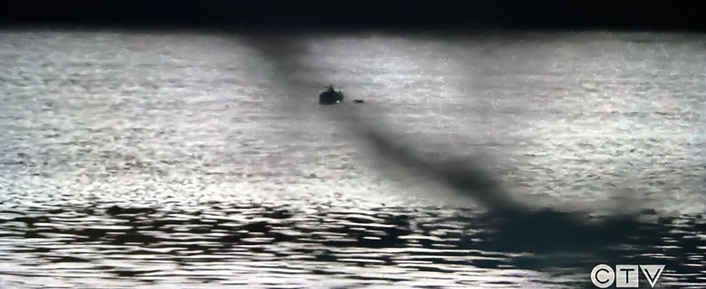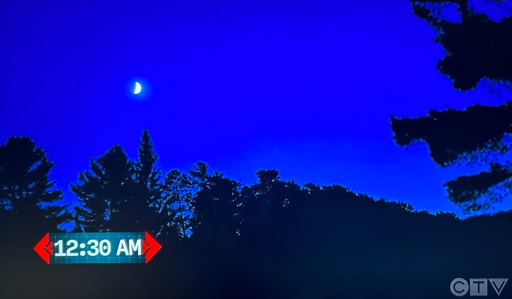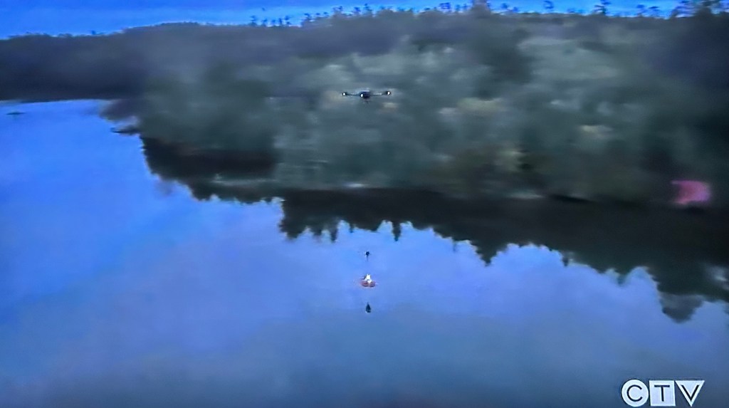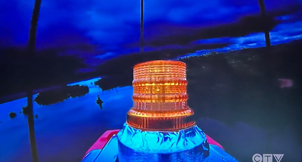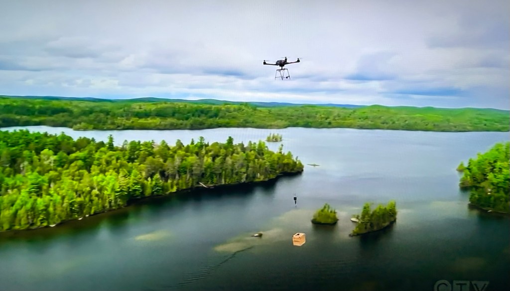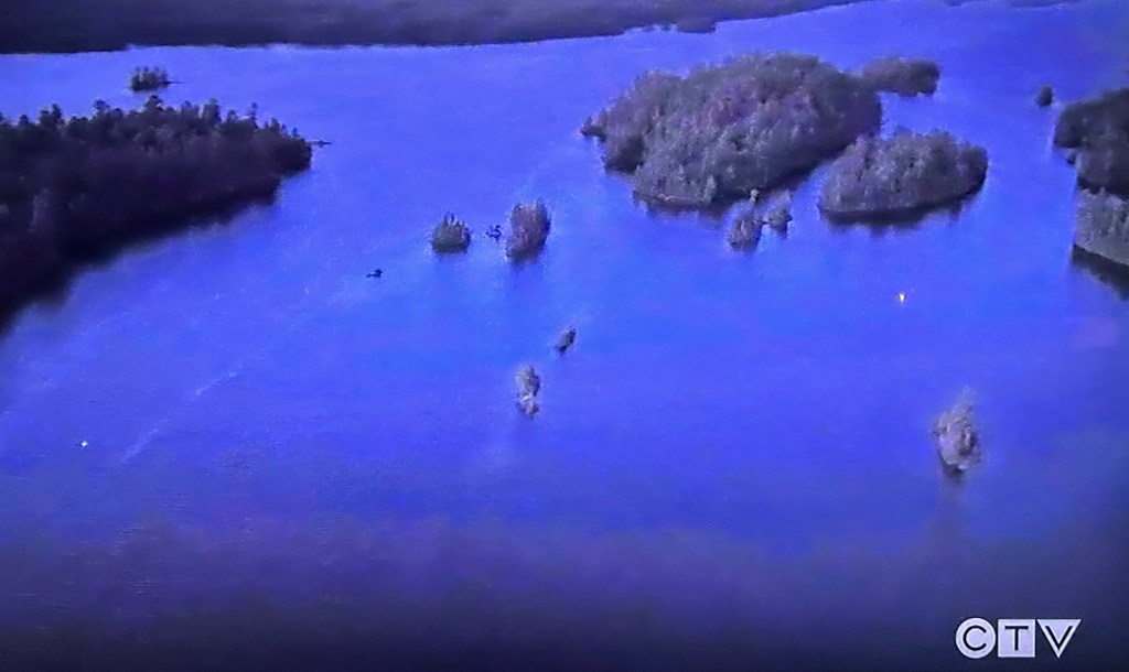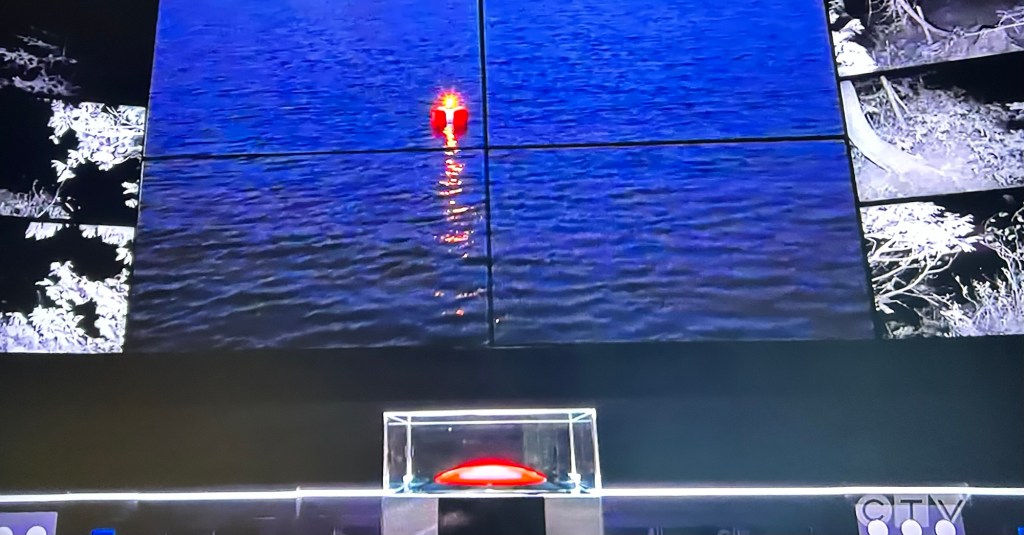 The episode ends later on that night when a weather alert comes onscreen. The temperature has dropped to below freezing. A drone drops two buoys in the lake with lights on, so you can see them.
