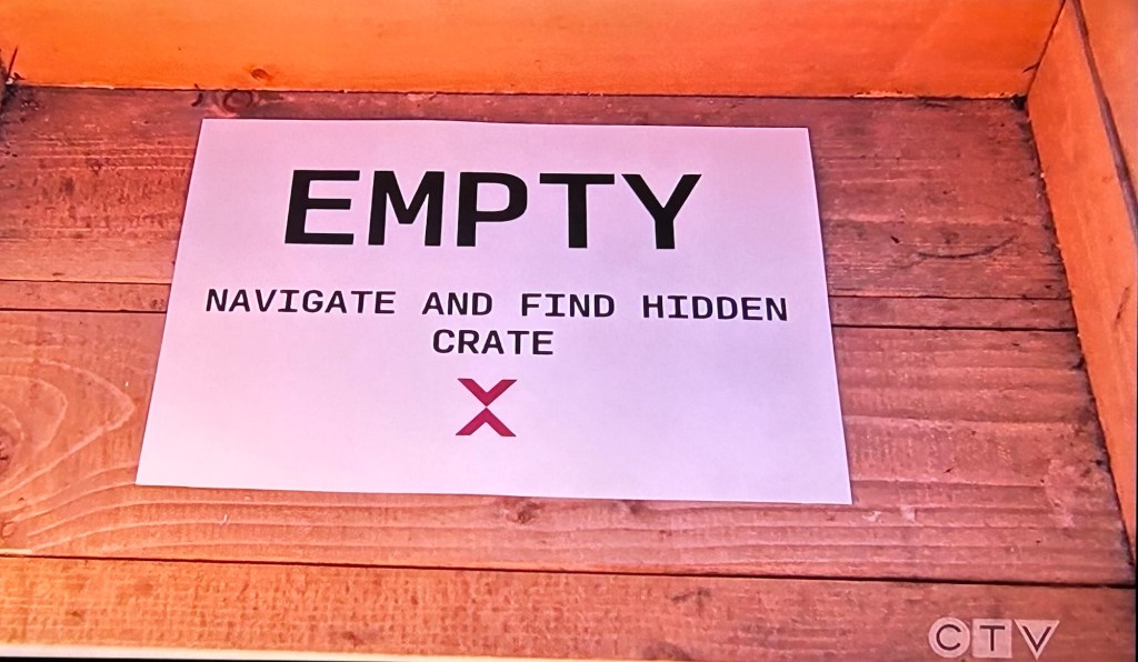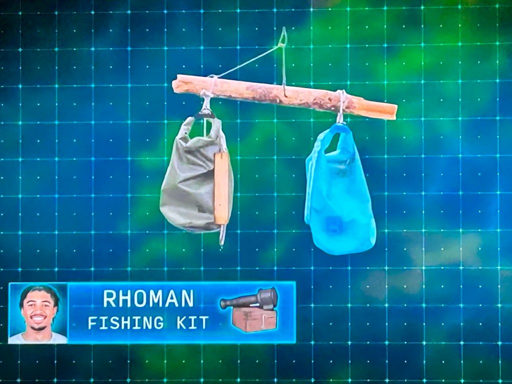 Rhoman finds his crate and watches Dallas and Lyndsey pass on the “clue’s” message. If he gives up his fire making supplies, he’ll get fire, food and water after twenty-four hours.