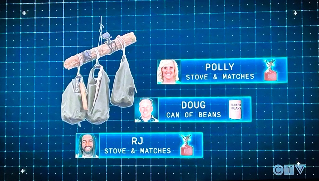 In the second round, Polly, Doug and RJ compete against each other doing the same thing. Doug is like a speed swimmer or something and not only reaches the bags, he gets it untied first. He wins RJ’s and Polly’s bags too. So he’s got fire on top of fire now.
