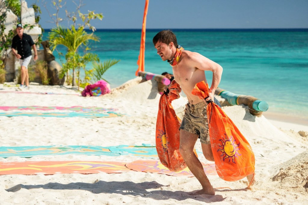 The immunity challenge involves swimming to a tower, climbing up it to grab down four bags full of coconuts. Once they get four bags, they have to empty them to find four keys. These unlock a grappling hook, which they then have to grab a bag with five sandbags. They have to toss the sandbags onto five different levels, way up high.